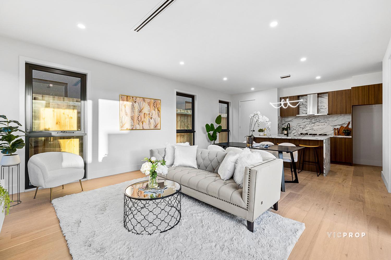 The sleek kitchen is beautifully appointed with sparkling stone benchtops, European stainless steel appliances, gas cooking, a dishwasher, and excellent storage, while a convenient study nook adds extra flexibility for working or studying from home. Both bedrooms feature built-in robes, with the main bedroom complemented by a modern ensuite. Additional features include high ceilings, LED downlights, split-system heating and cooling, a concealed European-style laundry, and a secure car space with additional storage.
