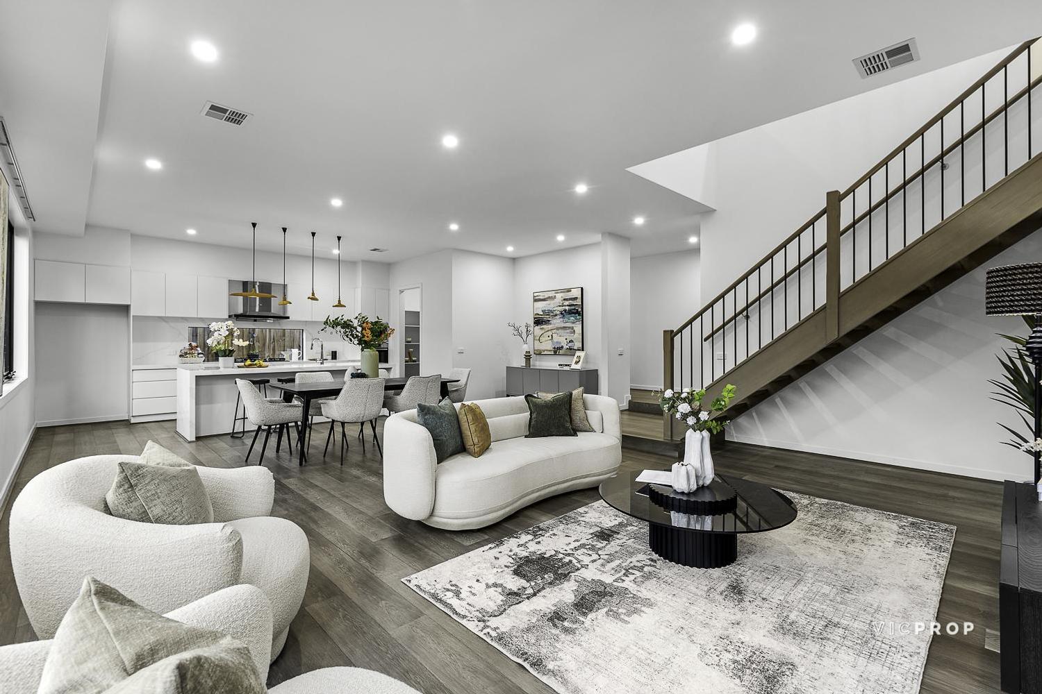 Making a statement with its use of recycled brick, Wormy Chestnut solid timber floors, Zimbabwe black granite benchtops, 3m approx. ceilings and impressive spans of double glazing that frame the gardens, this premier home has a securely gated side walkway to the glass framed entrance, a relaxed lounge with mudroom nook opposite, a superbly spacious downstairs main bedroom with vast walk in robe and bold dual vanity ensuite, a custom fitted study and a swish powder room.
